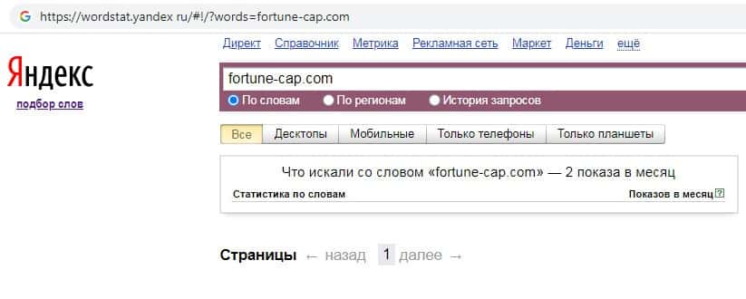 Количество брендовых запросов названия домена компании без точки "fortune-cap com" на Яндекс Вордстарт составляет также 2 запроса за месяц.