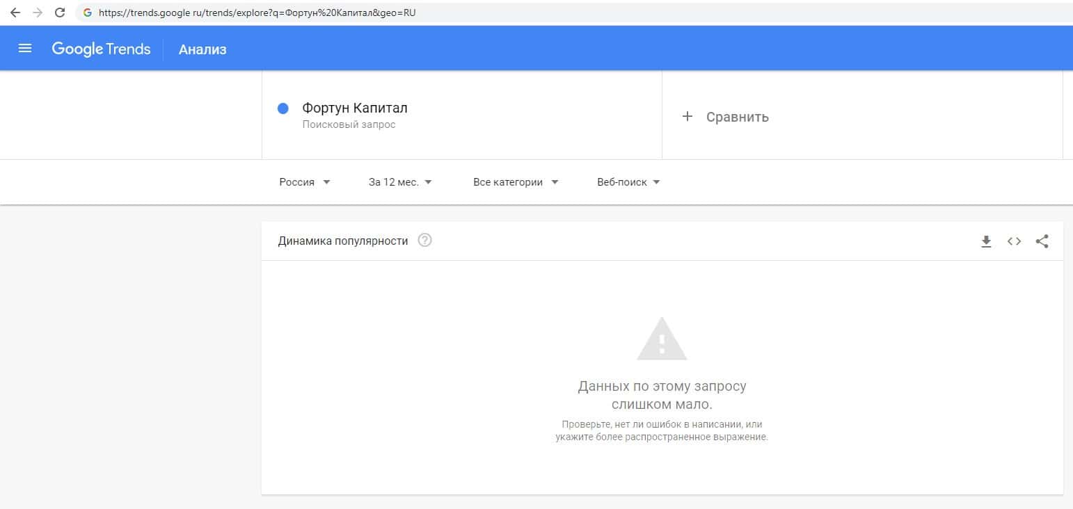 По количеству брендовых запросов названия компании на русском языке с пробелом "Фортун Капитал" на Гугл Трендс нет никаких данных.