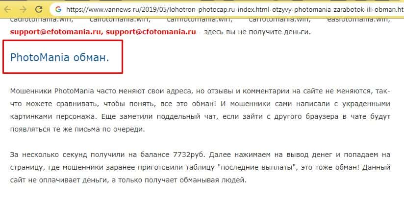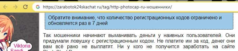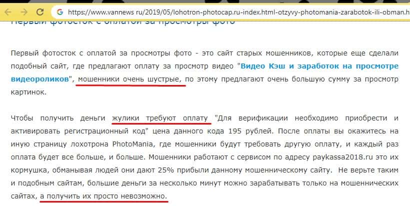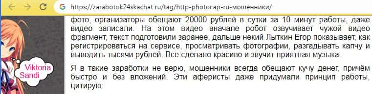 Далее в статье продолжается разоблачение аферистов PhotoCap Ru и расписывается о том, что ее стоит доверять таким и подобным сайтам, как Фото Мания, потому что большие деньги за несколько минут можно зарабатывать только на мошеннических сайтах, а получить их просто невозможно. Как говорится, бесплатный сыр только в мышеловке.