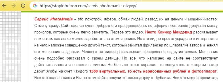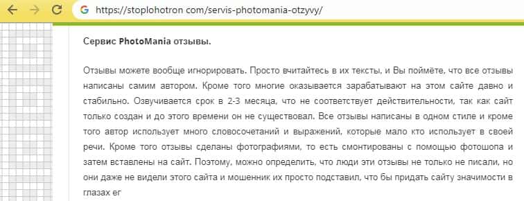 На странице описывается то, что сервис PhotoMania – это лохотрон, афера, обман людей, развод их на деньги и мошенничество. А также отмечено, что официальный сайт сделан очень добротно и правдоподобно, но аферисты все равно допустили массу проколов, которые очень легко заметить даже не профессиональным взглядом.