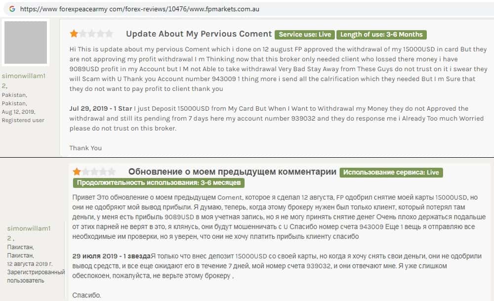 Среди кучи проплаченных хороших отзывов о шарашкиной конторе FP Markets есть и правдивые. Всё дело в том, что мошенники не выплачивают обещанных денег своим вкладчикам. Это афера чистой воды, лохотрон, из которого обратно нельзя получить ни копейки.