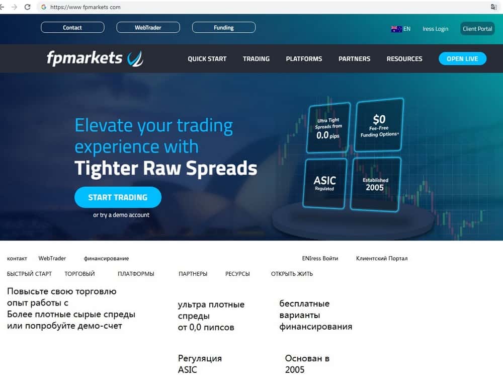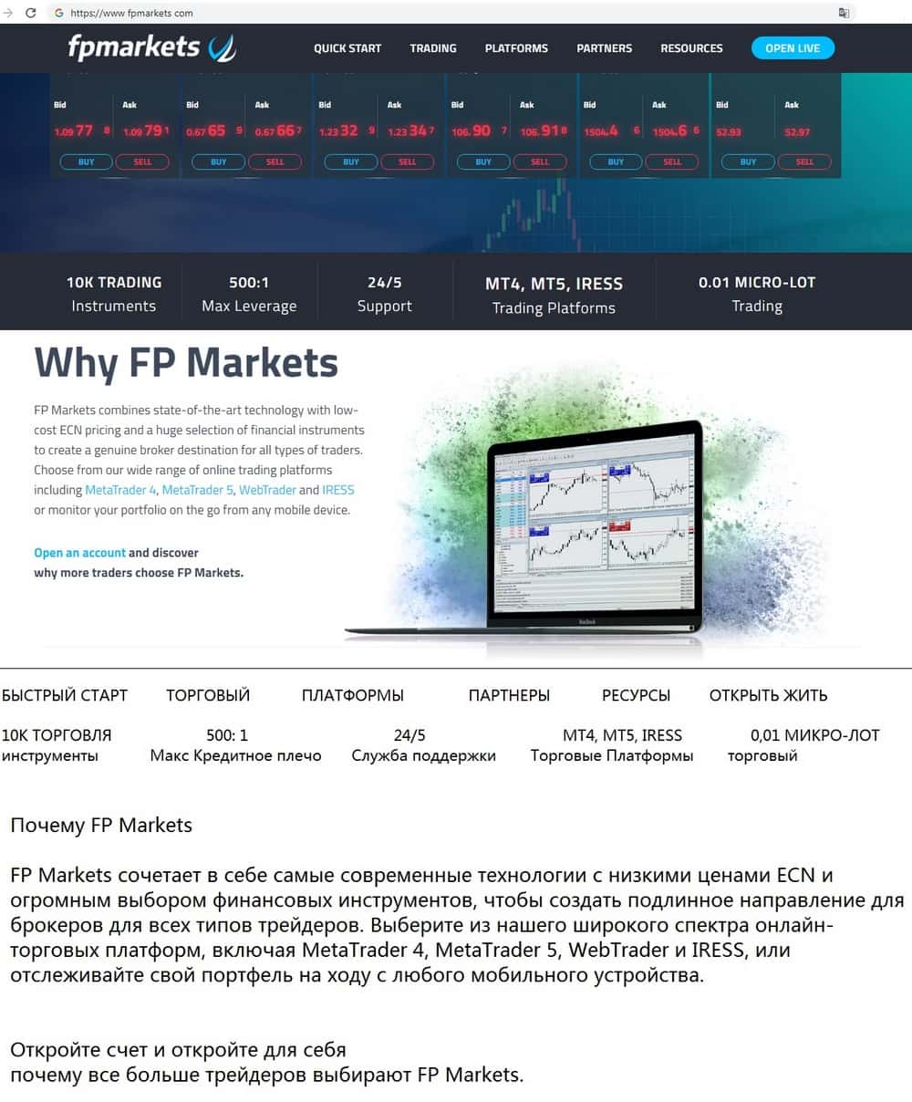На первой открытой странице сайта FP Markets - замануха, рассчитанная на неопытного трейдера. Тут и нулевые спреды, и отсутствие необходимости в финансировании. Но если попробует новичок испытать платформу, и глазом моргнуть не успеет, как жулики выудят все его денежки подчистую.