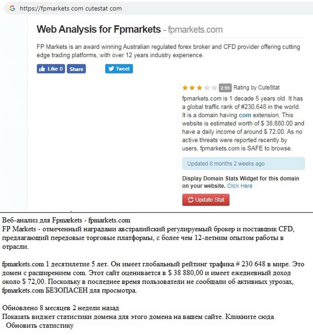 Ниже представлены официальные данные о домене компании FP Markets. Длительность существования лохотрона по облапошиванию клиентов - 15 лет, IP-адрес располагается в США. Поскольку жулики удаляют большинство негативных отзывов в сети, данный сайт рассматривается поисковиками, как безопасный.