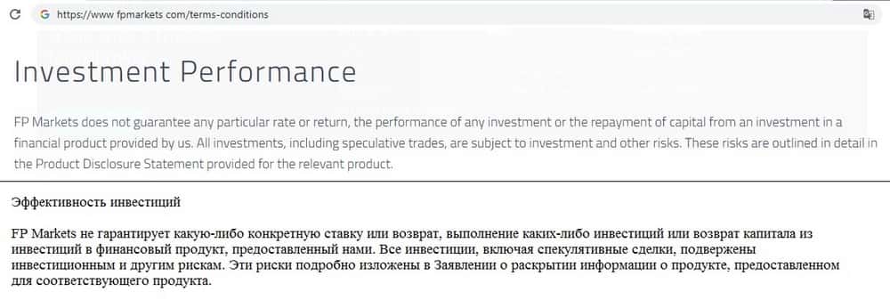 Следующий пункт гласит об отсутствии гарантий со стороны кухни-брокера ФП Маркетс. Лохотронщики сразу открещиваются от любых возможных возвратов или своей вины в них. Клиент, подписавший договор, сам рискует своими деньгами. Инвестиции в данный хайп принесут лишь убытки.