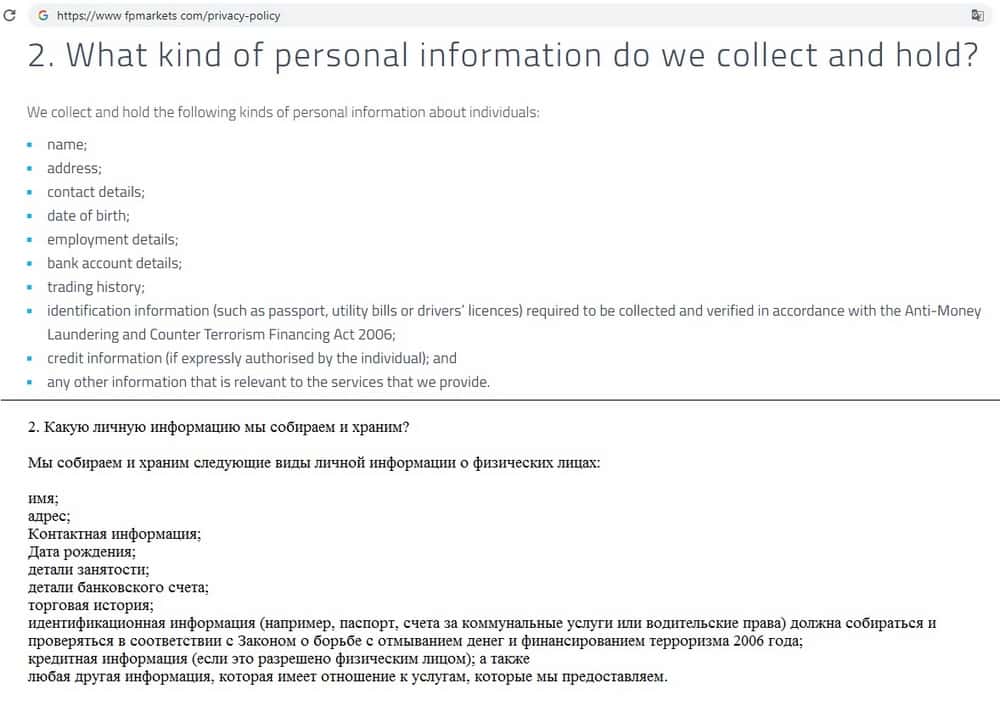 Политика конфиденциальности шарашкиной конторы FP Markets детально прописывает, что именно жулье желает получить от своих клиентов. Тут и личная информация, и данные о его карточках, сумме заработков, кредитная информация, даже копии паспорта и водительского удостоверения.