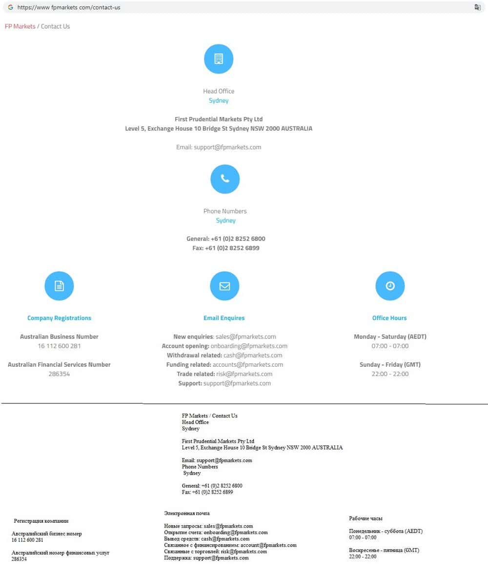 В разделе контактов молодчики из FP Markets выложили массу всего, не боясь жалоб обставленных клиентов. Не зря же жулики надежно подстраховались, прописав отказ от ответственности в своем договоре. После того, как депозит клиента слит, все эти службы перестают быть доступными. Перечень контактов: