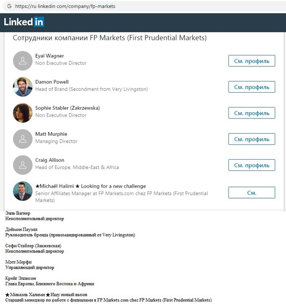 Мошенники не делятся с посетителями сайта о том, кто руководит шарашкой ФП Маркетс. Но данные в сети есть, например, на портале Linkedin. В качестве управляющего директора указан Matt Murphie, ранее занимавший пост специалиста по рискам в инвестиционной компании. В числе директоров также: