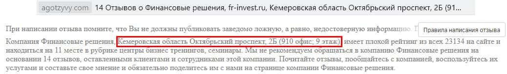 Благо, сайты, на которых нам удалось найти отзывы о работе шарашкиной конторы FR Invest обладают некоторыми сведениями касательно того, где находится офис данной мошеннической организации. Эти данные были найдены на сайте agotzyvy com:
