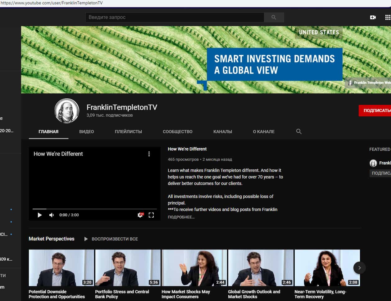 Для размещения различных мотивационных видеороликов с лапшой на уши наивной клиентуре аферисты Franklin Templeton обзавелись страницей в социальной сети YouTube, где у мошенников Франклин Темплетон имеется несколько тысяч подписчиков. На изображении, расположенном ниже, вы можете увидеть страницу аферистов на Ютубе.