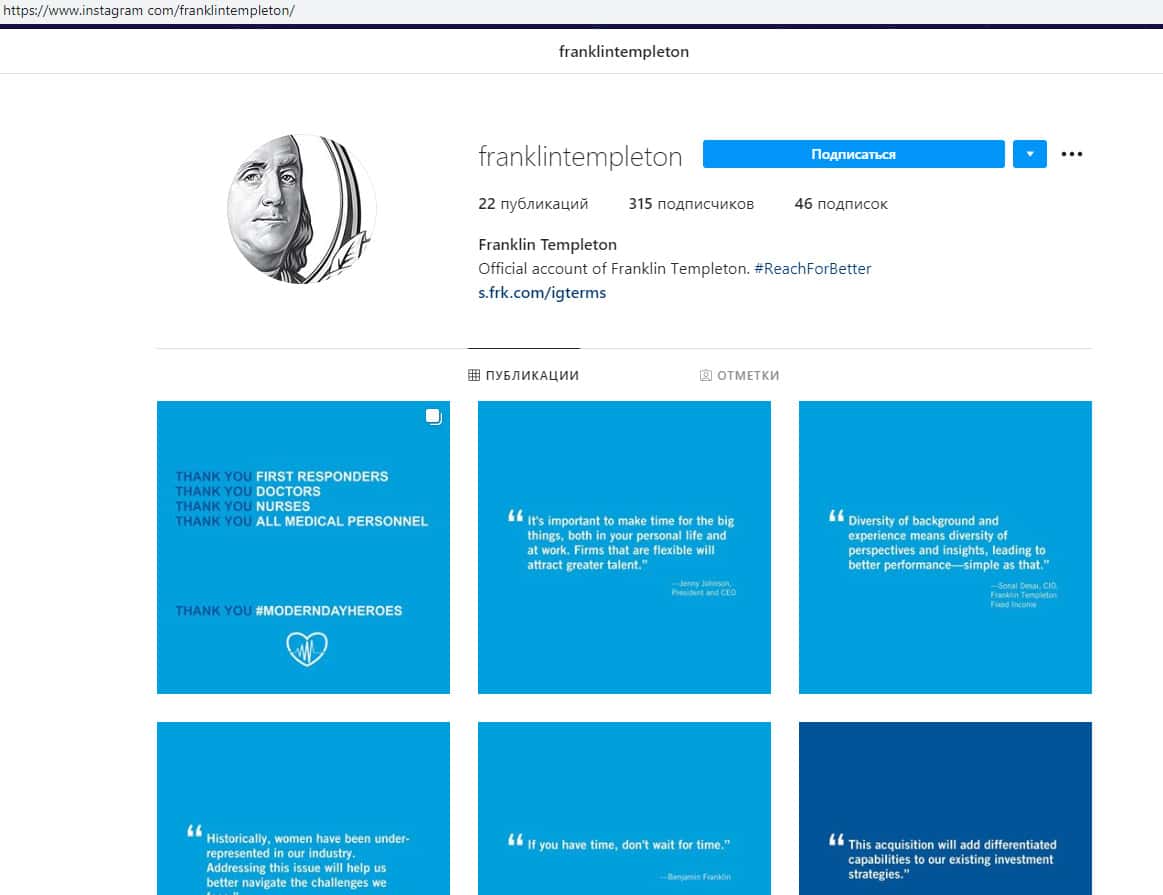 Имеется у шулеров Франклин Темплетон и страница в нынче популярной социальной сети Инстаграм, где у аферистов Franklin Templeton всего несколько сотен подписчиков, что говорит о не особом внимании шулеров к данной социальной сети или же нежелании тратить на нее средства. На изображении ниже вы можете увидеть страницу жулья в Инстаграме.