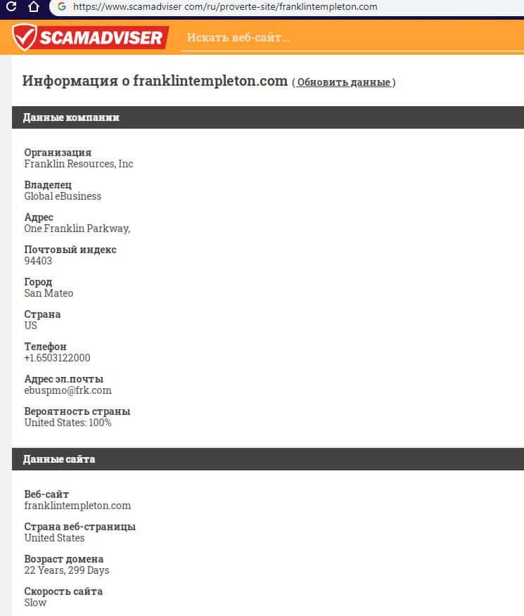 scamadviser com - сайт с технической информацией о жуликах Франклин Темплетон