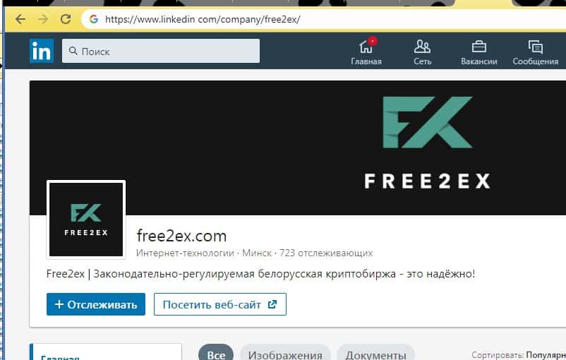 Дабы соответствовать современным трендам шулера Фри 2 Экс создали себе страницы в социальных сетях, одной из которых является Linkedin, где у мошенников Free2Ex имеется чуть более тысячи подписчиков. На изображении, расположенном ниже, вы можете увидеть внешний вид страницы проходимцев в социальной сети ЛинкедИН.