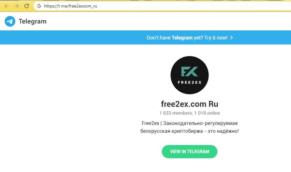 Конечно же есть и канал в социальной сети Телеграм. Аферисты Фри 2 Экс набрали около 800 подписчиков, что является скудным результатом для крупной биржи. Видимо с маркетингом у них все очень печально, поэтому и мы не советуем переходить по ссылке на данную социальную сеть, и тем более сотрудничать с кухней Free2Ex.