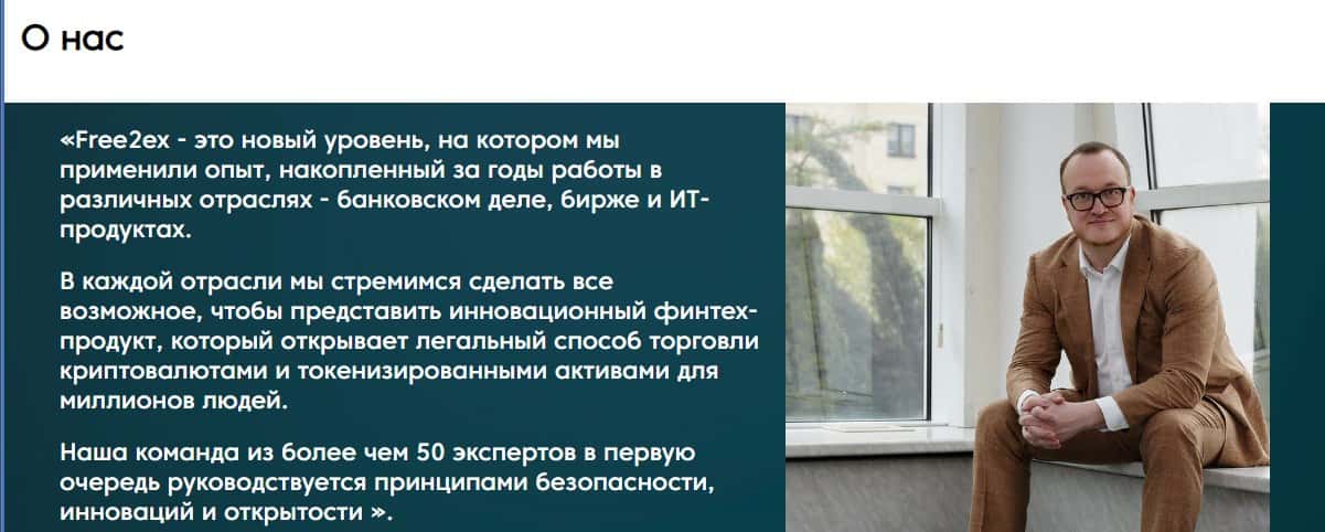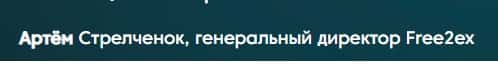 Чтобы было более менее правдоподобно, вместе с лапшой на уши наивной клиентуре аферисты Фри 2 Экс решили выложить инициалы и должность - Артём Стрелченок, генеральный директор Free2Ex, на своем сайте. На изображении, расположенном ниже, вы можете увидеть этот раздел аферистов.