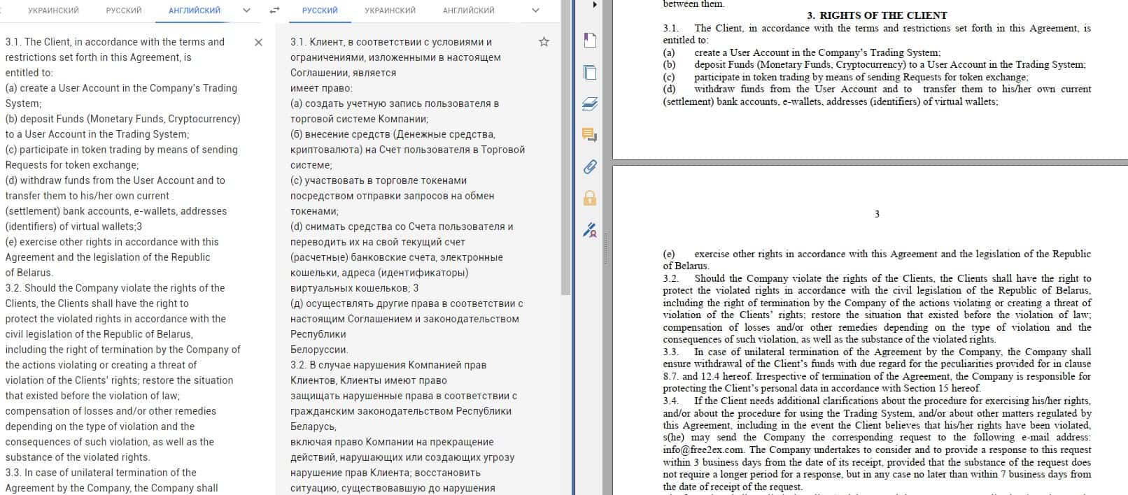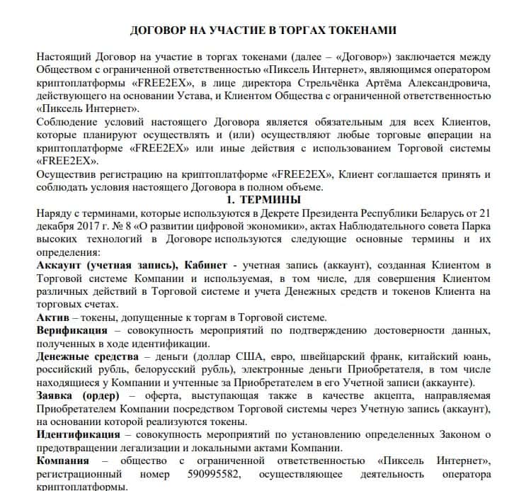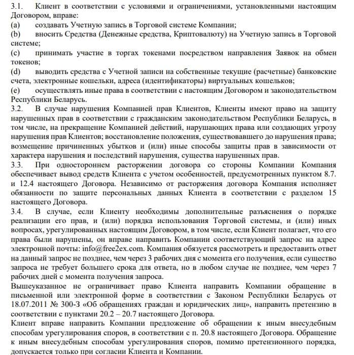 На официальном сайте мошенники Free2Ex не выкладывают отдельных документов политики или условий сотрудничества, зато есть единый документ-договор, в котором описаны все моменты, входящие в сотрудничество сторон. Ниже вы видите первый раздел условий сотрудничества с аферистами Фри 2 Экс.