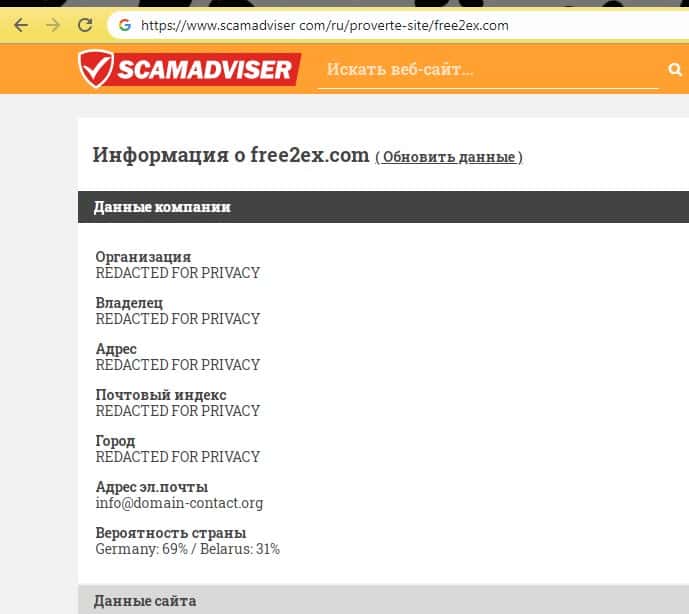 Анонимности всех данных подвальной кухни Free2Ex просто зашкаливают и им бы позавидовал даже самый хороший тайный агент. Из-за своих противоправных действий и не законной деятельности руководители мошеннической организации Фри 2 Экс предпочитают не отвечать перед своими кинутыми трейдером и выбирают анонимность.