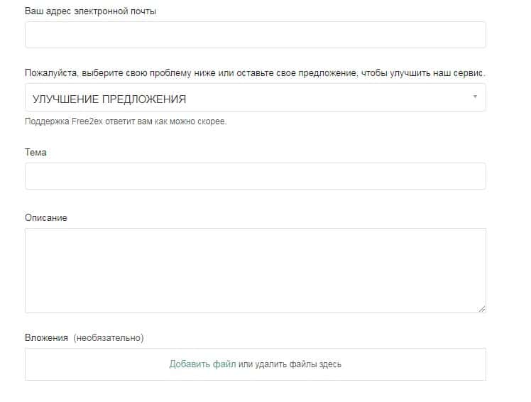 Также на в разделе контактов аферисты Free2Ex решили сделать заявку, и когда клиент ее отправит, поддержка ее получит и постарается исполнить все, что будет указано. В общем сделано все для того, чтобы никак не иметь прямого контакта с клиентом. Все путем сообщений и разных заполнений форм.