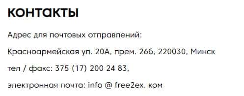 Под свои довольно сомнительные контакты аферисты Free2Ex отвели отдельный раздел своего сайта, но также жулики Фри 2 Экс разместили свои контакты и в конце подвального сайта. Контактов у шулеров Free2Ex довольно мало. Перечень фальшивых контактов наглых мошенников Фри 2 Экс в отдельном разделе:
