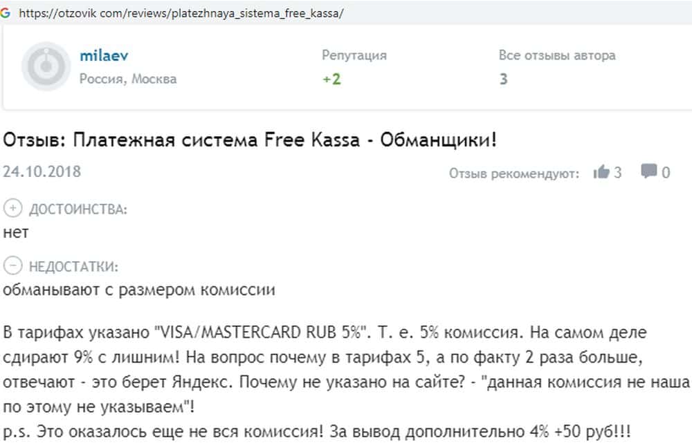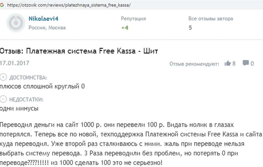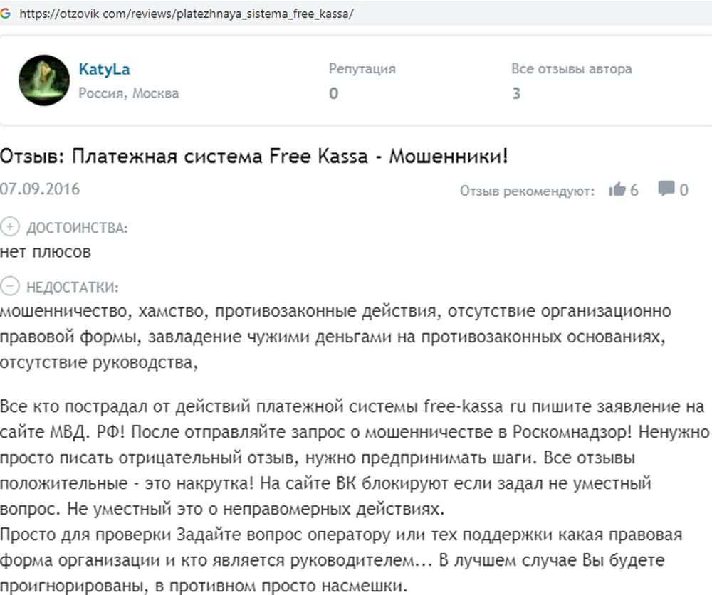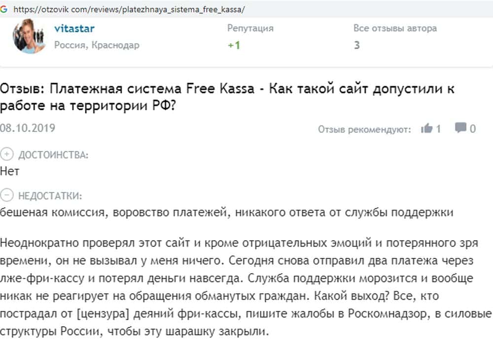 Согласно отзывам otzovik com, люди пользуются услугами ростовщиков Free-Kassa только один раз, случайно. Повторно обращаться к жуликам ни у кого желания не возникает - сервис работает с перебоями, как и служба технической поддержки, а за кривые услуги разводилы умудряются брать громадные комиссии, которые составляют треть от платежа.