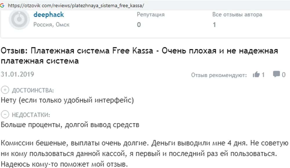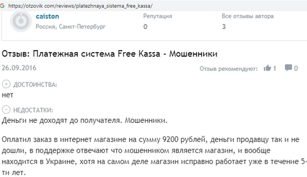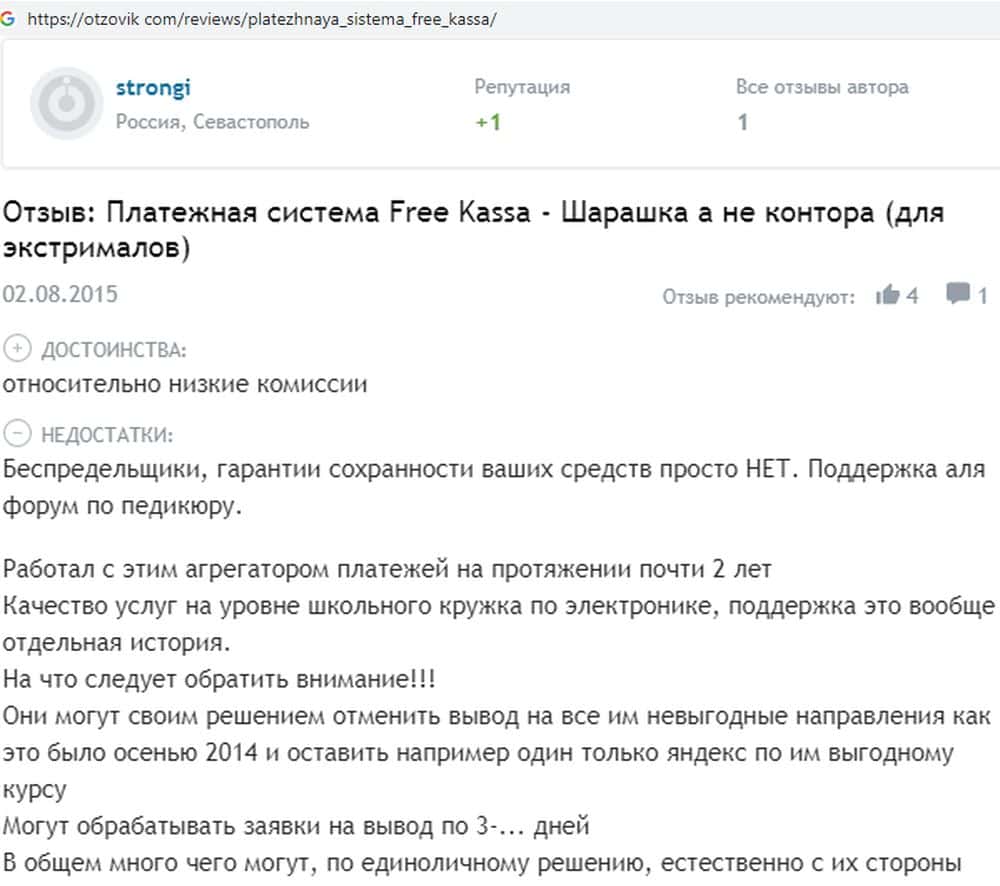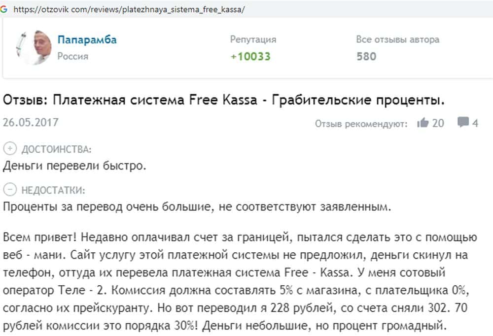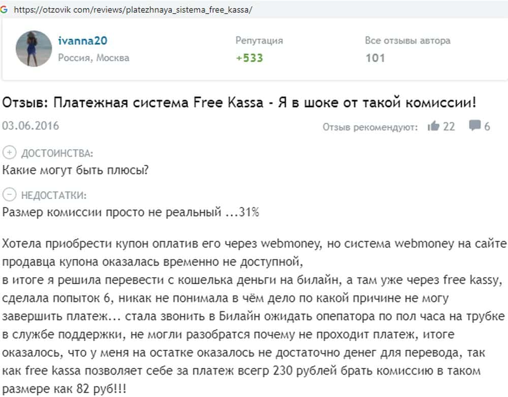 Согласно отзывам otzovik com, люди пользуются услугами ростовщиков Free-Kassa только один раз, случайно. Повторно обращаться к жуликам ни у кого желания не возникает - сервис работает с перебоями, как и служба технической поддержки, а за кривые услуги разводилы умудряются брать громадные комиссии, которые составляют треть от платежа.