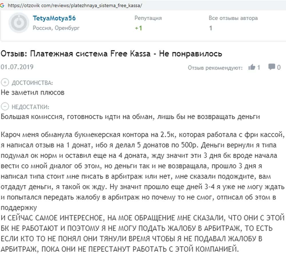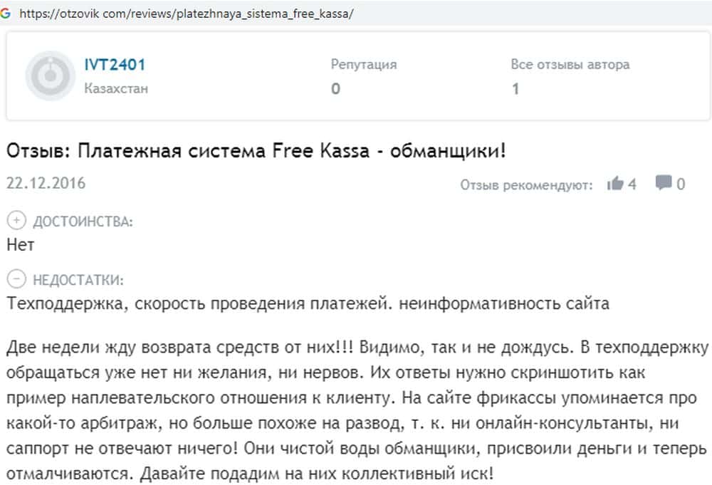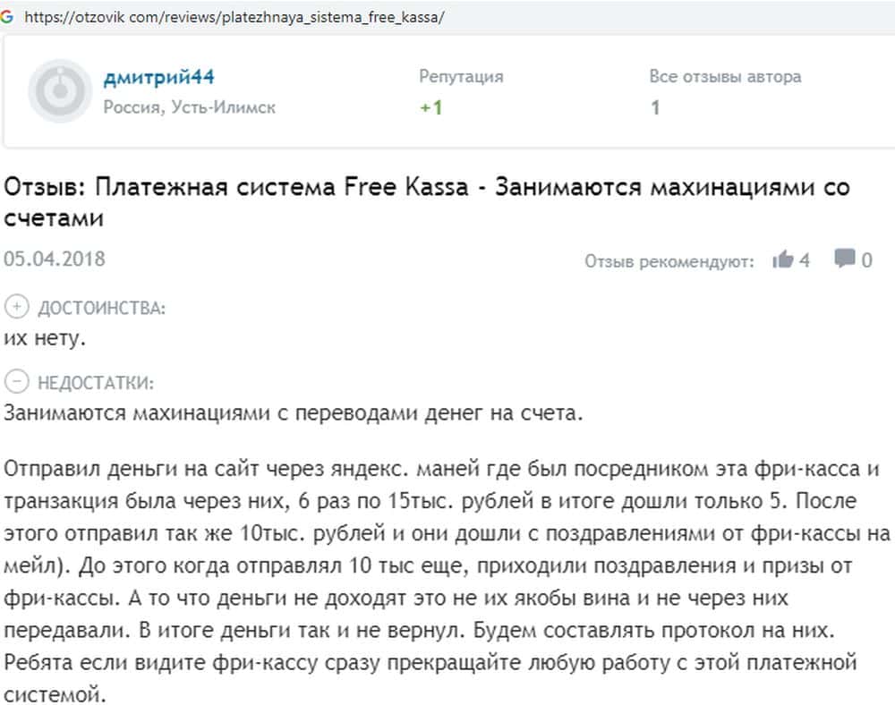 Очередной человек, обманутый лохотронщиками Фри Касса, рассказывает о негативном опыте сотрудничества со скам-сервисом порталу otzovik com. Подлецы утверждают, что выплатили ему деньги, но на счетах их нет - вопрос зашел в тупик и так и не был решен, выписки со счета жуликам в качестве доказательств не подошли, они стоят на своем.