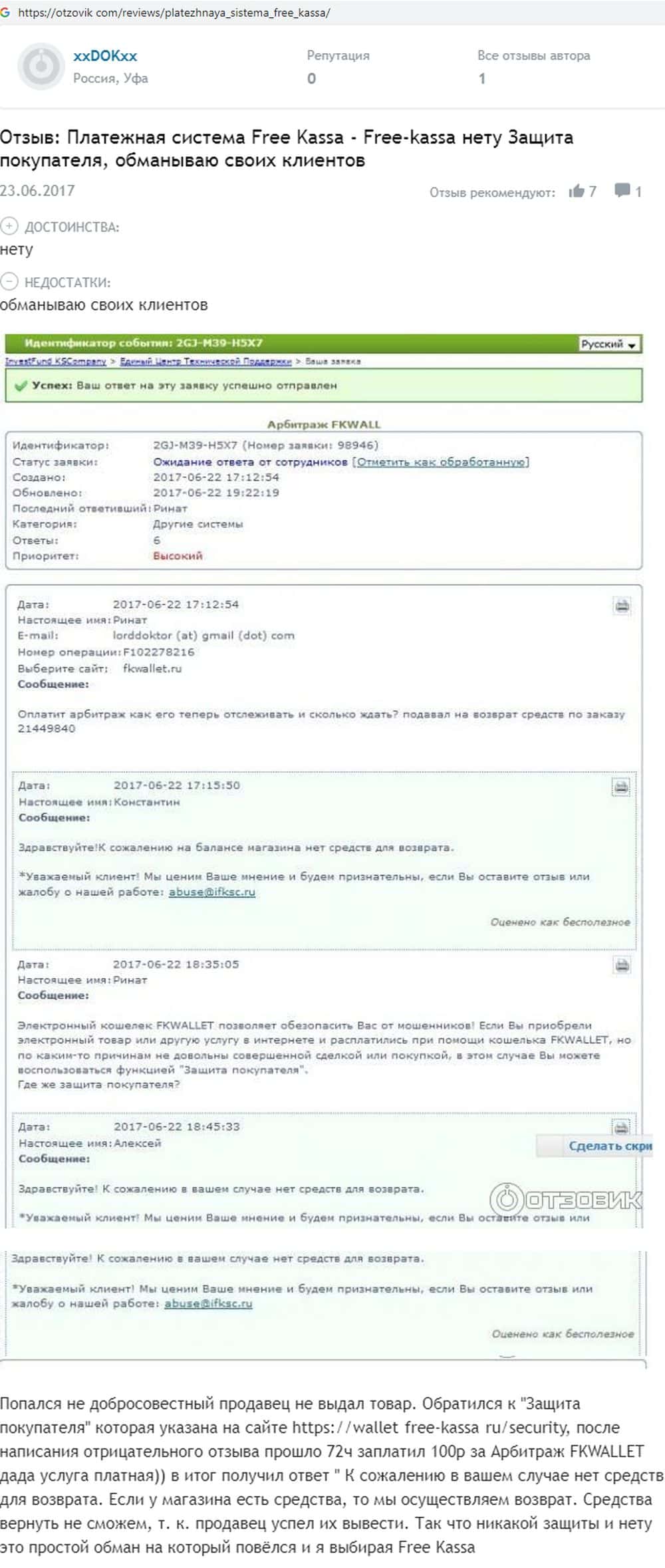 Деляги Фри Касса уверяют потенциальных клиентов, что их платежи защищены. У них якобы есть услуга арбитража, платная кстати, при помощи которой можно вернуть средства, если продавец оказался недобросовестным. Но на самом деле эта услуга не работает - ни денег за арбитраж, ни самого перевода клиентам не возвращают.