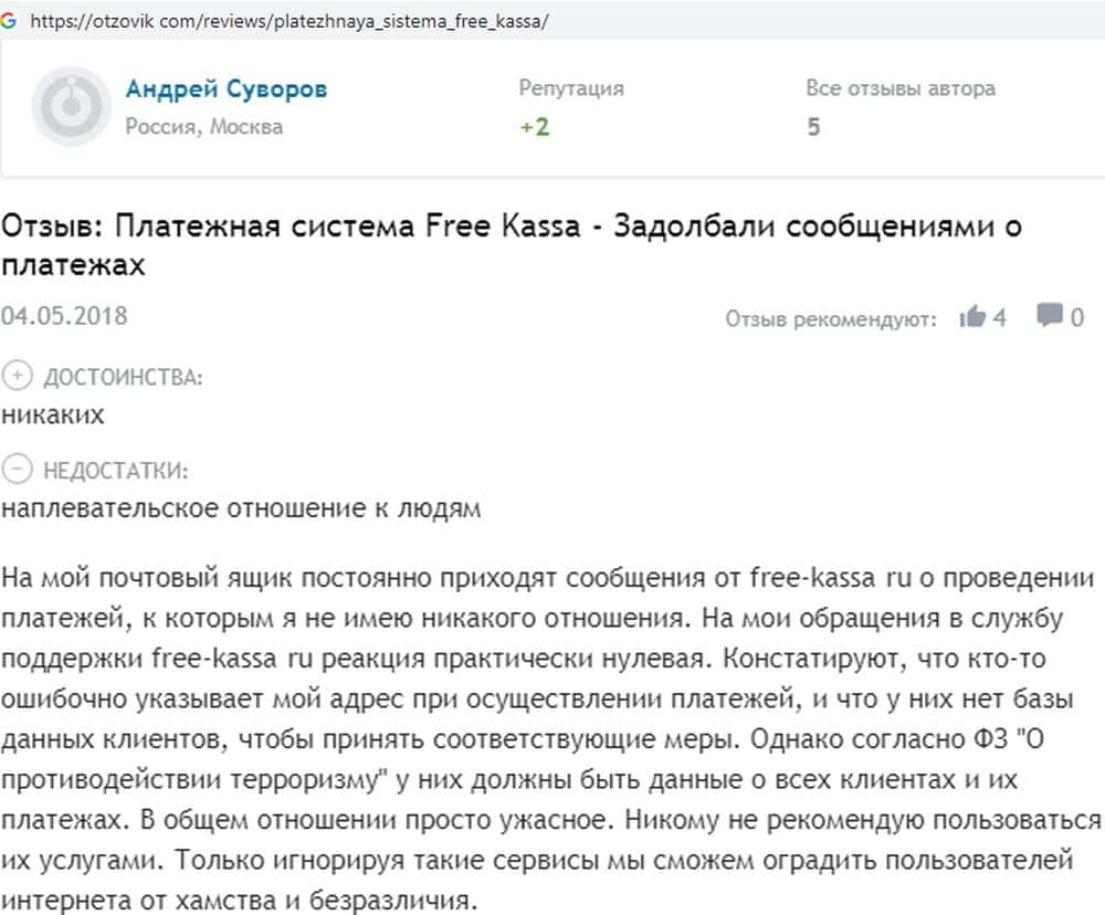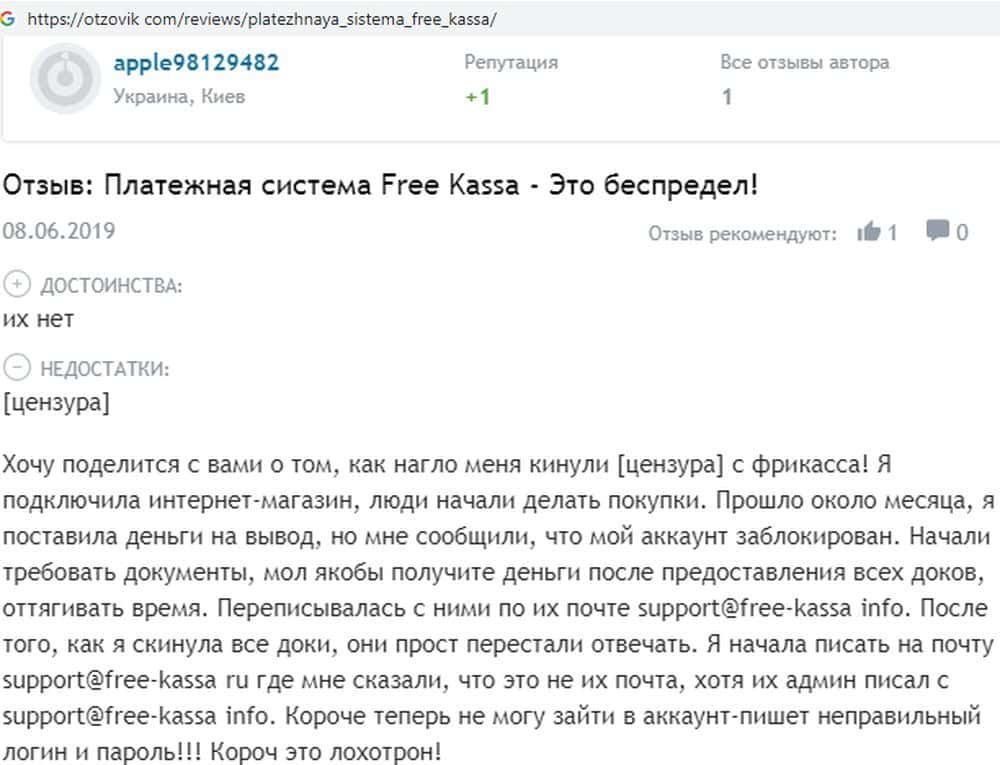 Пользователи интернет-сайта отзовик ком недоумевают, как шаражный сервис вроде Free-Kassa могли допустить к работе на территории России. Многие из них говорят, что кроме потерянного времени и нервов ничего от лохотрона под названием Free-Kassa не видели - при неоднократных попытках им воспользоваться платежи просто не доходят до получателя.
