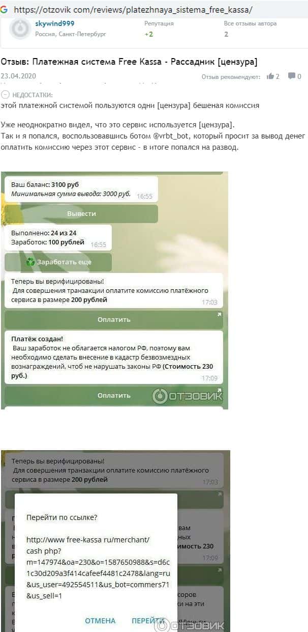 Пользователи интернет-сайта отзовик ком заметили, что липовый агрегатор Free-Kassa активно сотрудничает с лохотронами, совместно обворовывая пользователей. Один из потерпевших столкнулся с просьбой оплатить комиссию за вывод средств через этот скам-сервис, в результате ни денег, ни комиссии больше не увидел.