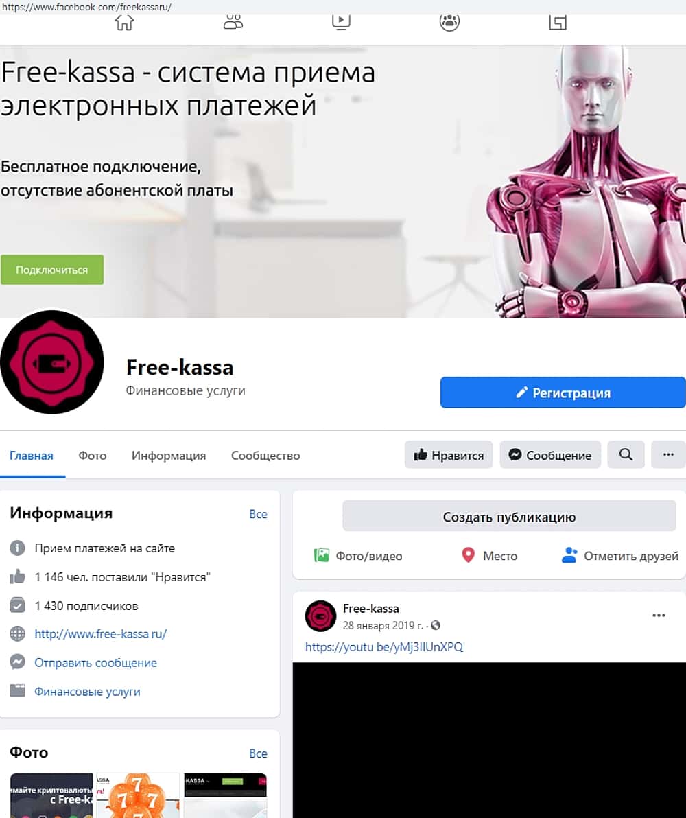 Разводняк Фри Касса также присутствует и в популярной зарубежной сети фейсбук ком. Здесь каталы Фри Касса не особо пользуются популярностью, но немного больше тысячи человек в свои поклонники захомутать успели. Контент в основном рекламного и новостного характера для привлечения дополнительных жертв в аферу.