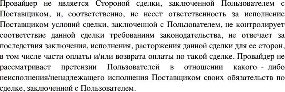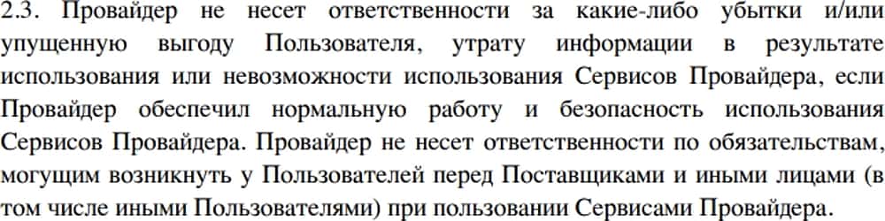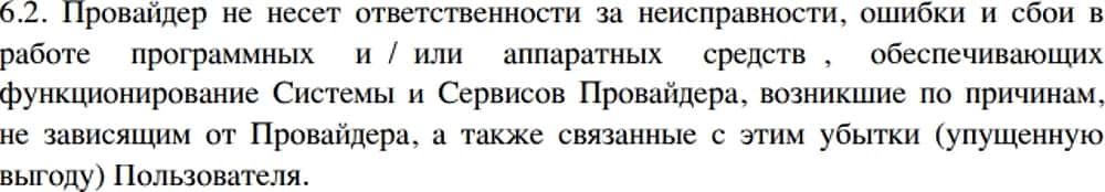 Далее шарлатаны Фри Касса, которые в псевдодоговоре именуют себя Провайдером, не берут ответственность за убытки, которые в процессе работы их липового сервиса могут понести клиенты и партнеры. Использовать сервис, владельцы которого не дают никаких гарантий надежности для своего дела крайне рискованно.