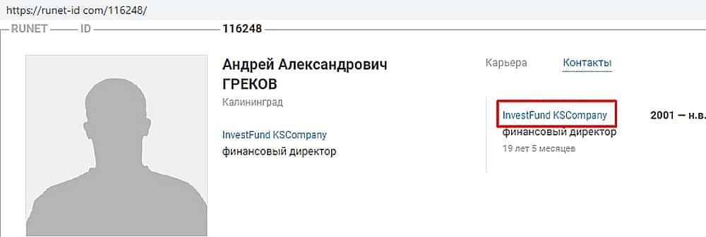 Сторонние же источники информации приоткрыли завесу лохотеатра Фри Касса. Поскольку владеет этой шарагой компания InvestFund KSCompany, то поискать пришлось ее коллектив. Ресурс рунет-айди ком выдал владельца этой сомнительной организации, а следовательно, он же является хозяином киберпритона InvestFund KSCompany. Вот он: