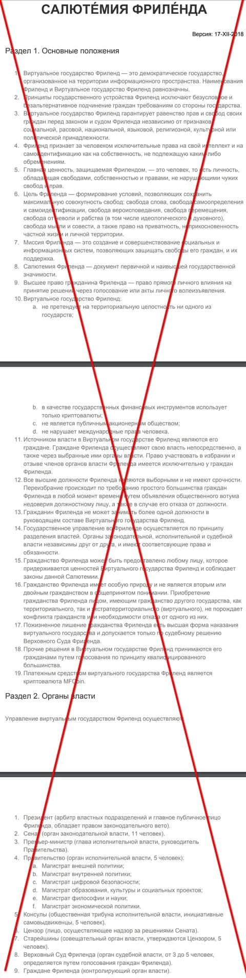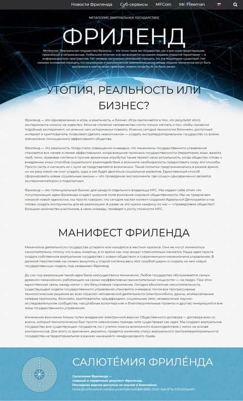 Начало официального сайта хайпа Фри Ленд начинается с описанием своей сути проекта, где рассказывают что это виртуальное государство в информационном пространстве. Больше похоже на шизофрению, которую могут схавать некоторые люди, уставшие от бездействия власти или от кидалова со стороны остальных шарашкиных контор. Таким образом мошенники пытаются нагнать как можно больше людей, что бы цена их выдуманной криптовалюты росла на бирже и понятное дело тогда владельцы зарабатывали. Конечно же аферисты Free Land внесли идеологическое основание, которое 50 на 50 имеет место быть.