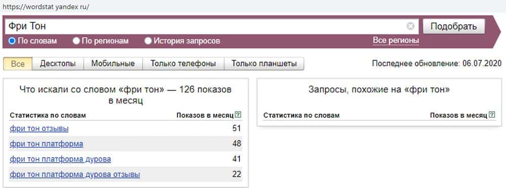 - Количество брендовых запросов аферы Фри Тон в Яндекс.Вордстат