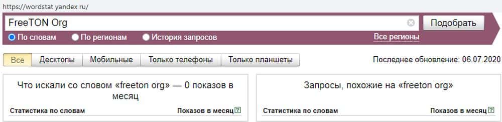 Что же касается самого домена FreeTON Org, тут количество запросов на нуле. Это связано с тем, что проект новый и отзывов на него нет, а сам сайт еще не известен среди инвесторов.