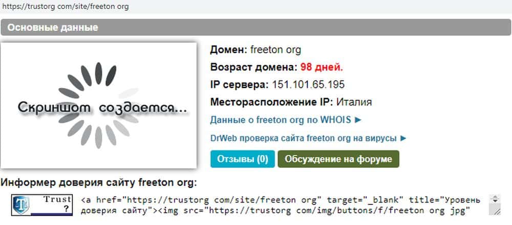 Согласно данным портала trustorg com, возраст лохотрона Фри Тон на момент написания статьи составляет всего 98 дней назад. Месторасположение IP - Италия.