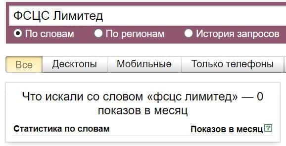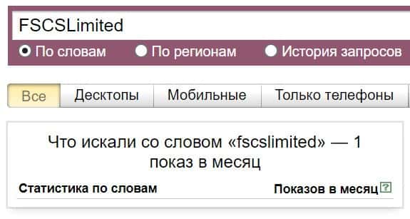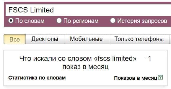 Название мошеннической конторы "FSCSLimited", написанное на английском языке, пользователи искали в системе Яндекс нечасто - всего лишь 1 показ.