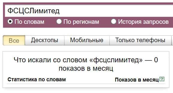Посмотрим, сколько раз люди искали название бренда "ФСЦС Лимитед" на русском языке с пробелами: результат 0 показов.