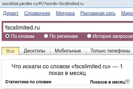 Название бренда на русском языке без пробела "ФСЦСЛимитед", пользователи не пытались найти в системе Яндекс ни разу.