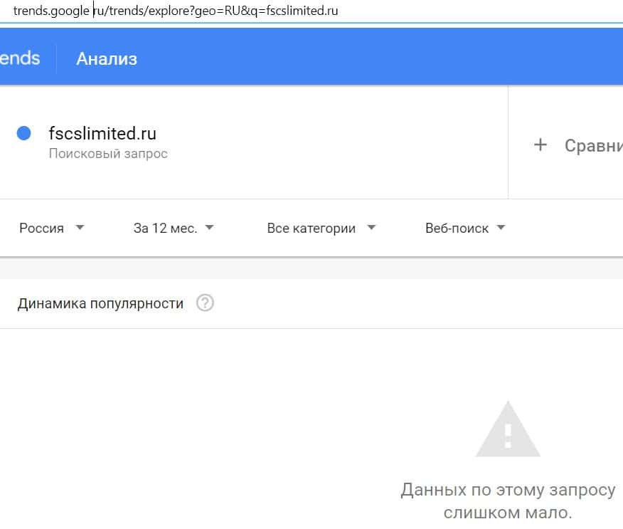 Доменное имя мошеннического сайта "fscslimited.ru" вбивали в поисковую систему Гугл слишком редко, поэтому данных по этому запросу практически нет.