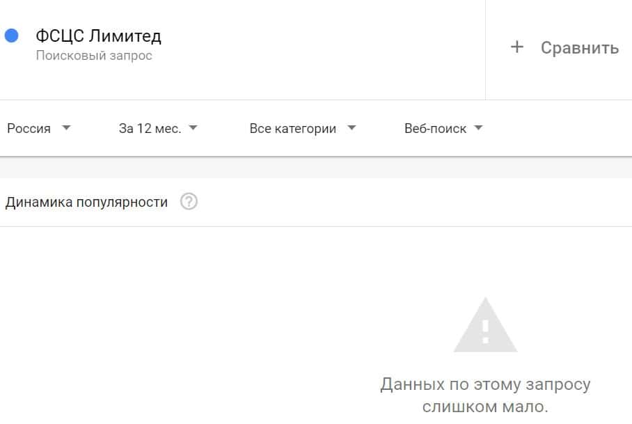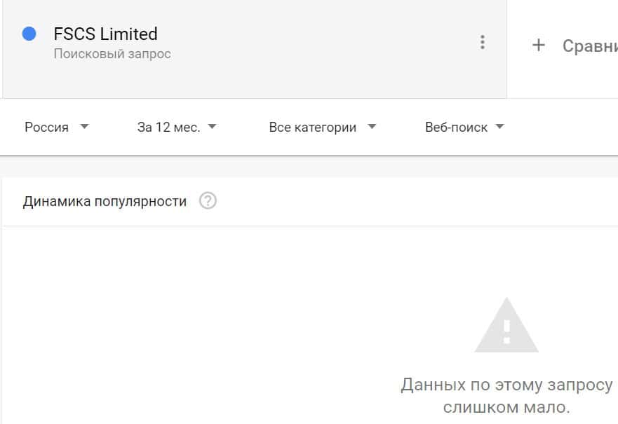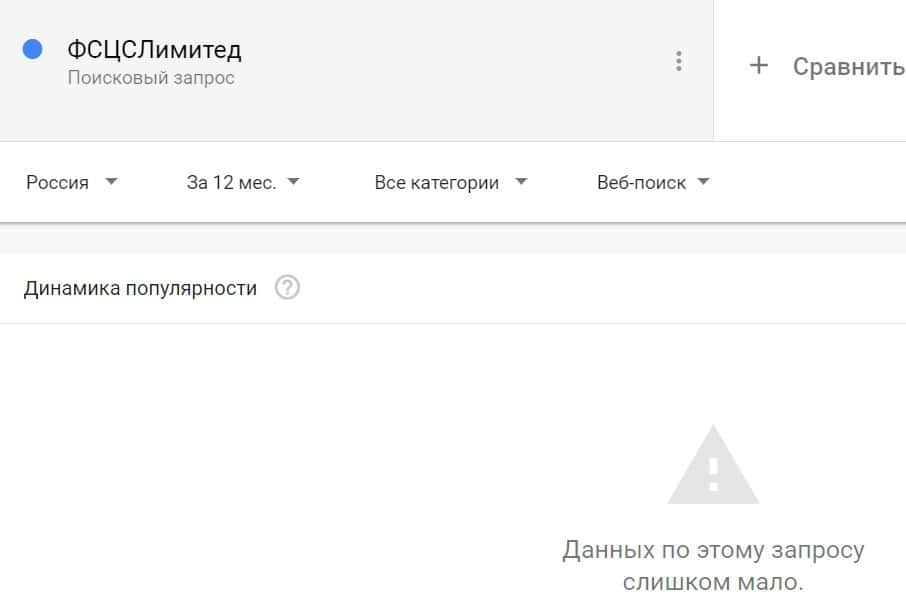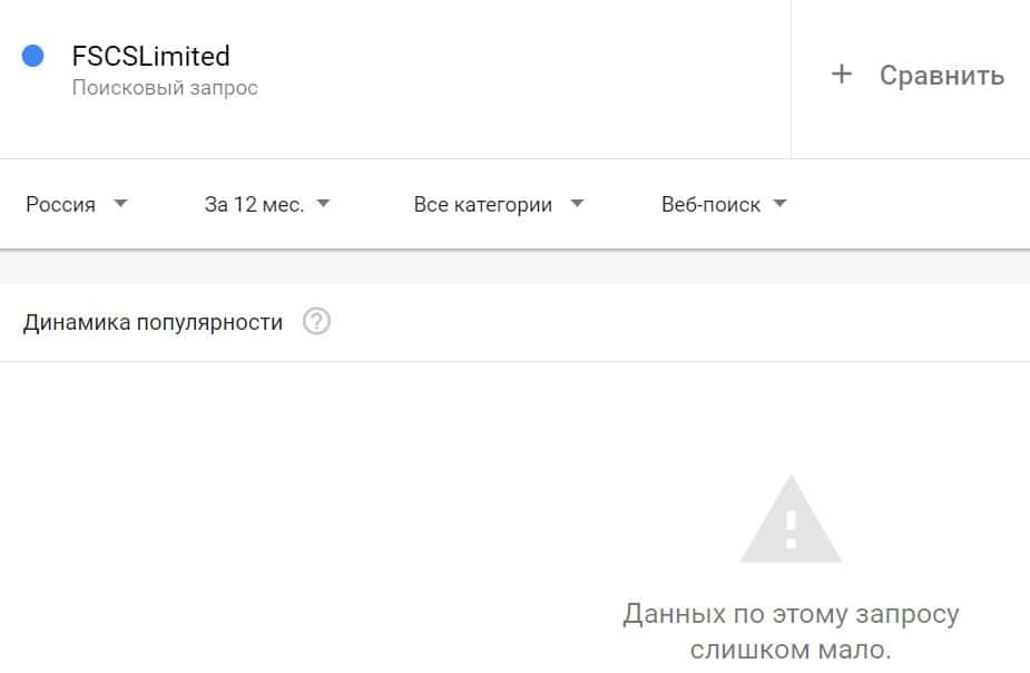 Посмотрим, насколько популярно название бренда "FSCSLimited", написанное на английском языке. Данных по этому запросу нет, так как никто не искал этот бренд в Гугл.