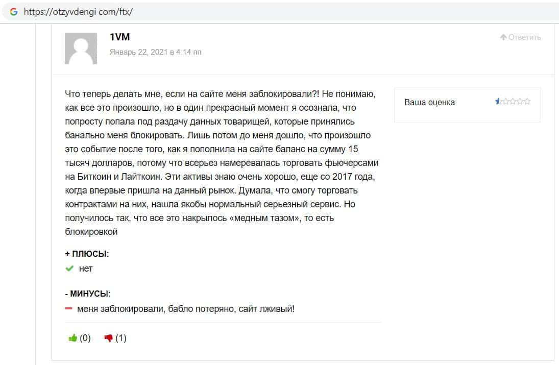 Пользователь написал отзыв о фирме разводил FTX, в котором указал, что данная организация является всего лишь лохотроном, который пытается обмануть инвесторов.