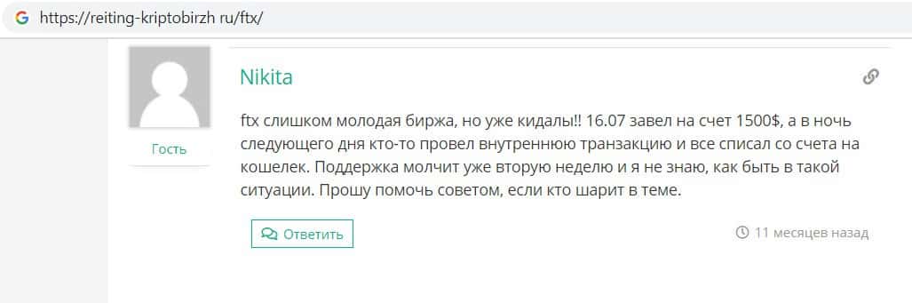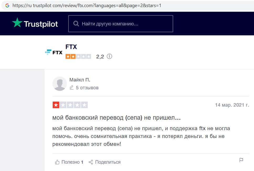 Бывший клиент лохотрона FTX написал отзыв, в котором сообщил, что мошенники так и не сделали денежный перевод, так как присвоили его средства, и больше он не доверяет кидалам.