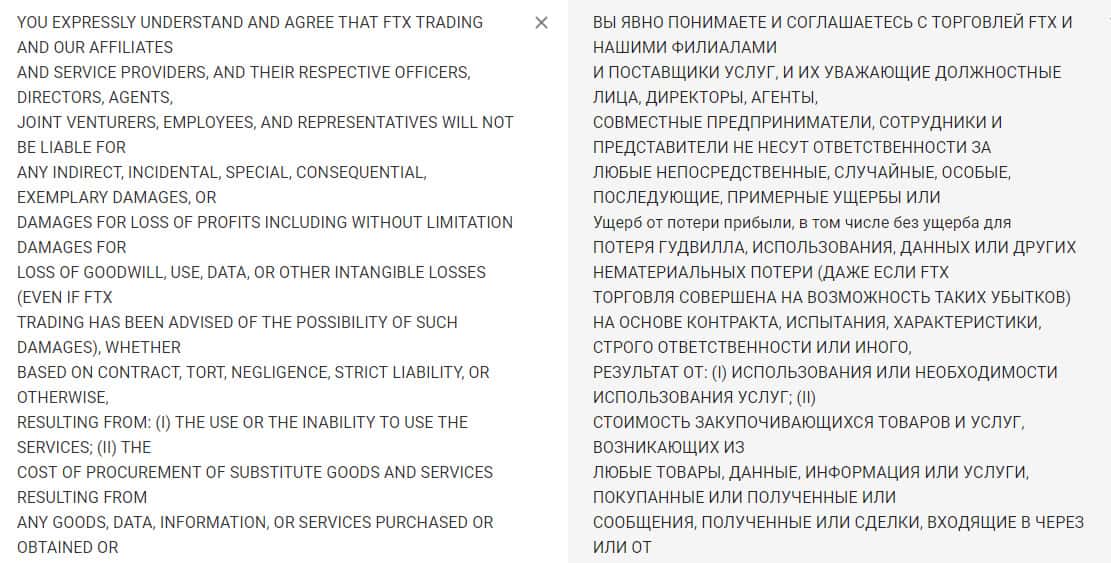 Чтобы не читать огромное соглашение, которое аферисты ФТХ предоставляют своим клиентам, то стоит отметить только один раздел, в котором лохотрон не несет ответственность за свою деятельность, а также не дает никаких гарантий, что все деньги, которые будут храниться на их счетах будут в целостности и сохранности.