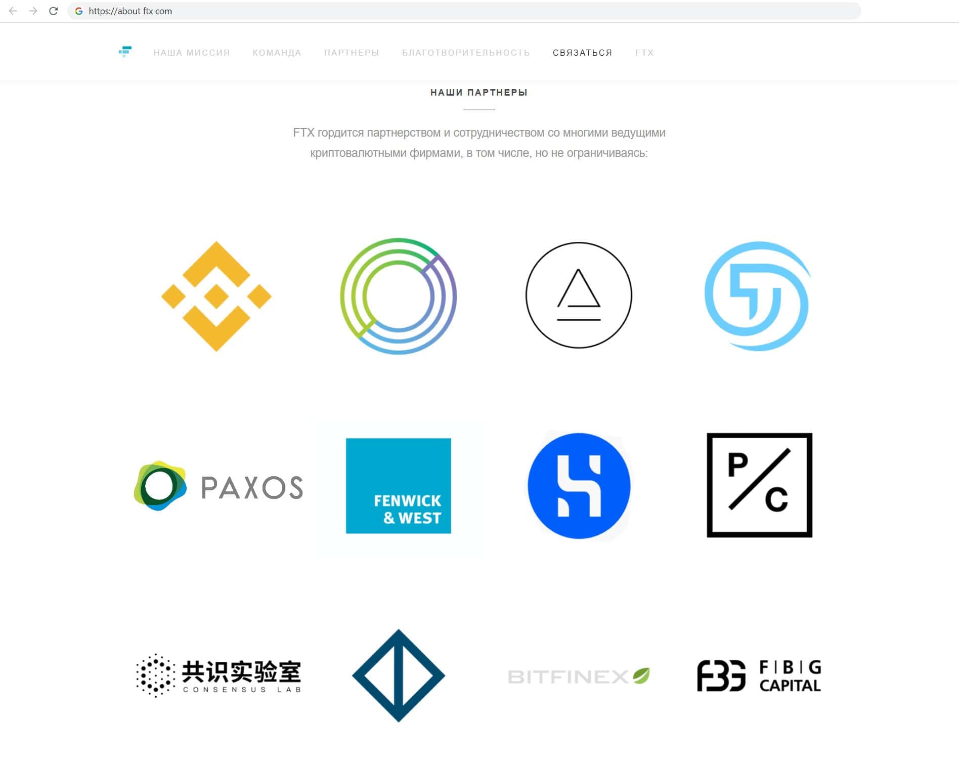 Мошенническая фирма ФТХ указала на своём сайте информацию о том, что гордится своими партнёрами, некоторые из которых являются опытными финансовыми аферистами.