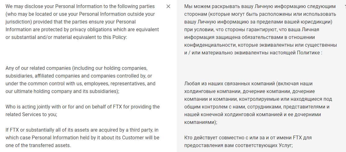 В политике конфиденциальности четко прописано, что криптовалютный лохотрон FTX имеет право раскрывать личную информацию о клиентах третьим лицам, при чем для этого есть множество предлогов. Если вы не хотите, чтобы на вас повесили какой-нибудь кредит, то просим не связываться с лохотроном ФТХ.