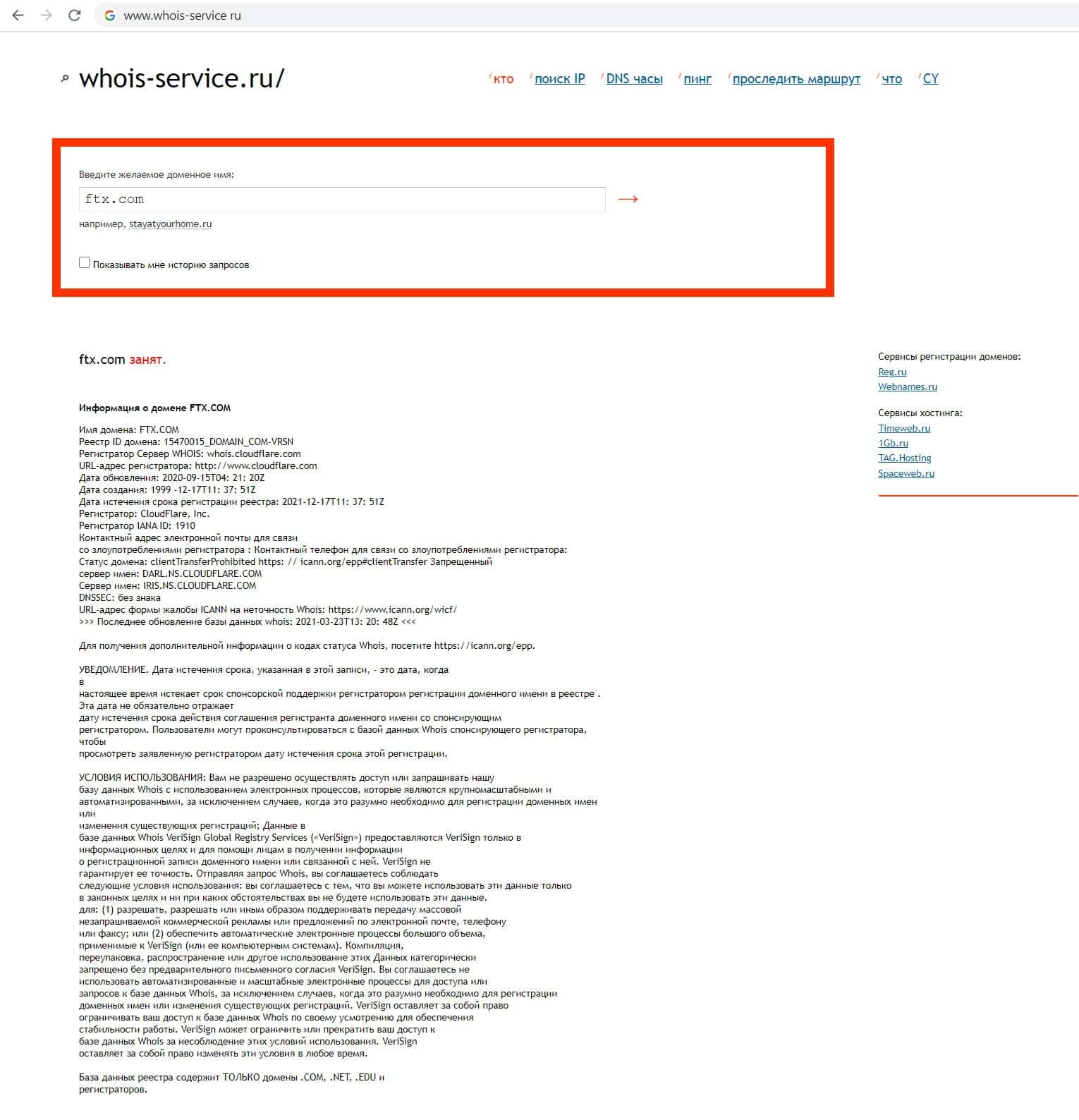 Мы использовали сайт whois-service ru, чтобы узнать владельца домена ФТХ. оказалось, что мошенники скрывают данную информацию, что является признаком мошенничества.