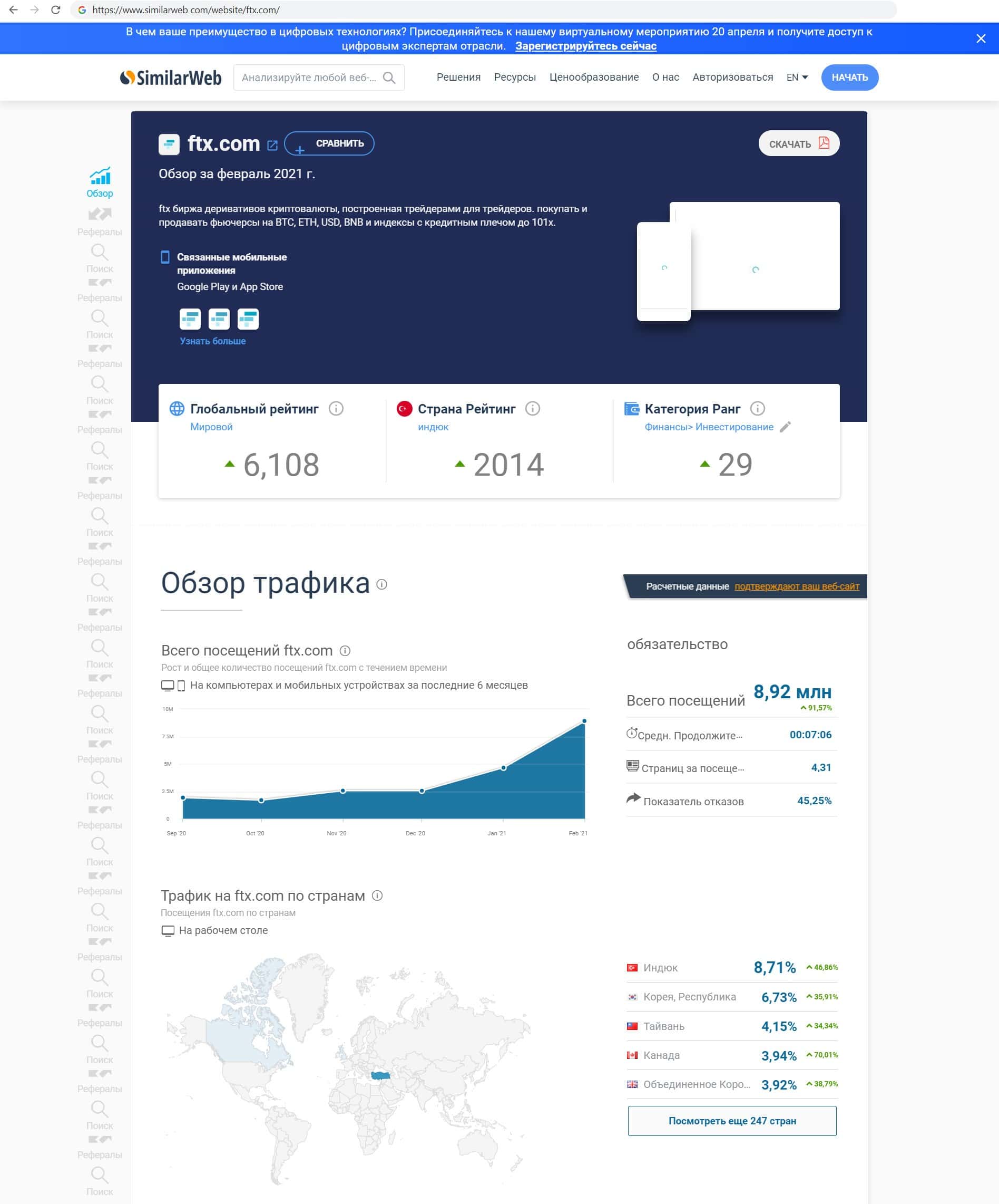 С помощью сайта similarweb com мы решили узнать трафик сайта аферистов ФТХ. Оказалось, что данный ресурс посещают в основном жители Индюка и Кореи.