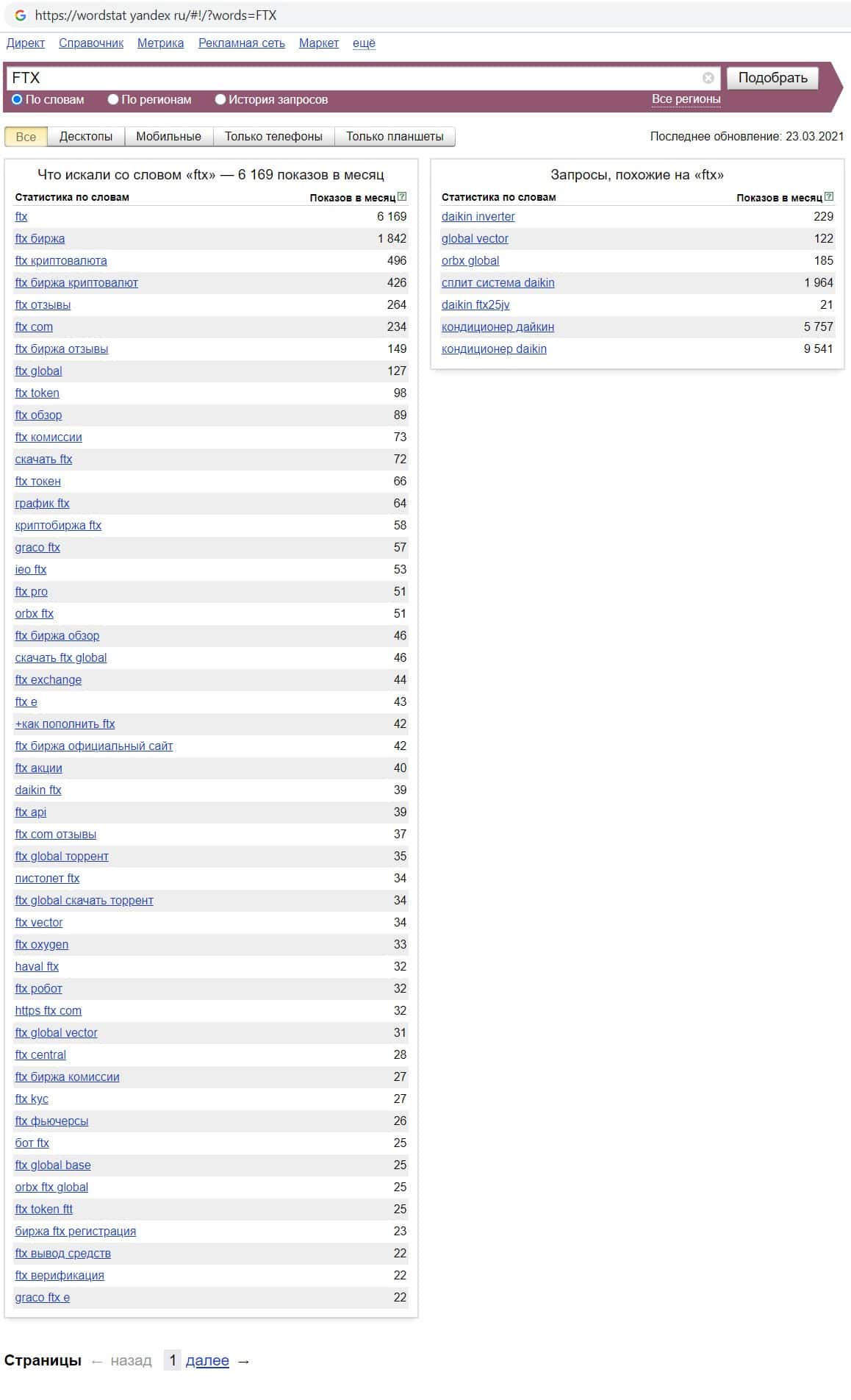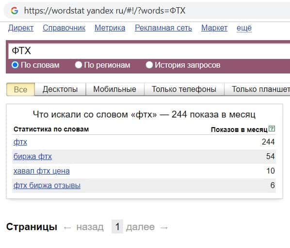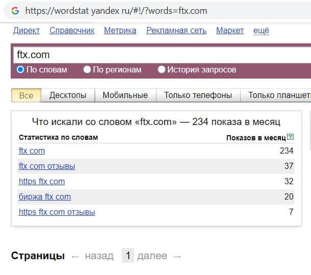 Мы проверили количество запросов мошеннической фирмы ФТХ в Яндексе по названию компании, а именно "FTX". Данный запрос пользователи совершили 6169 раз.