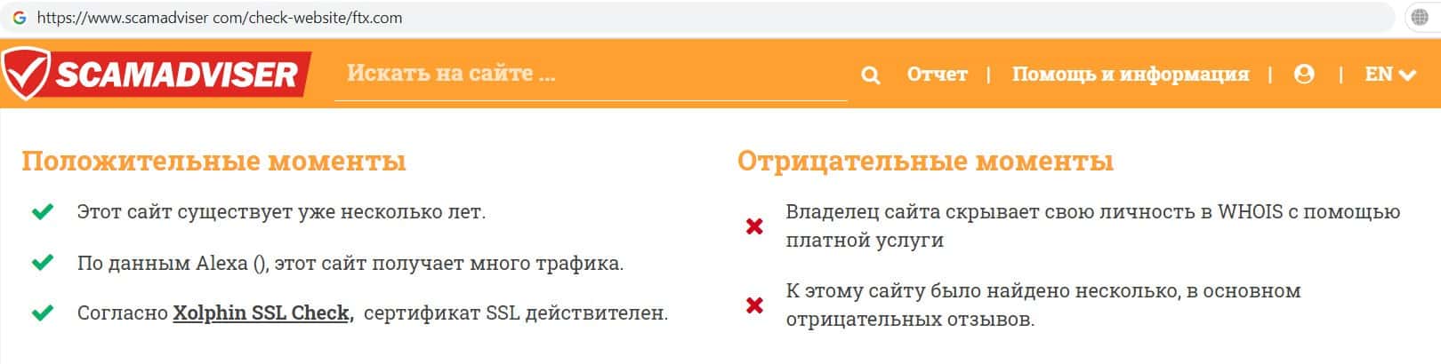 - Мнение интернет ресурса scamadviser com о сайте кидал FTX