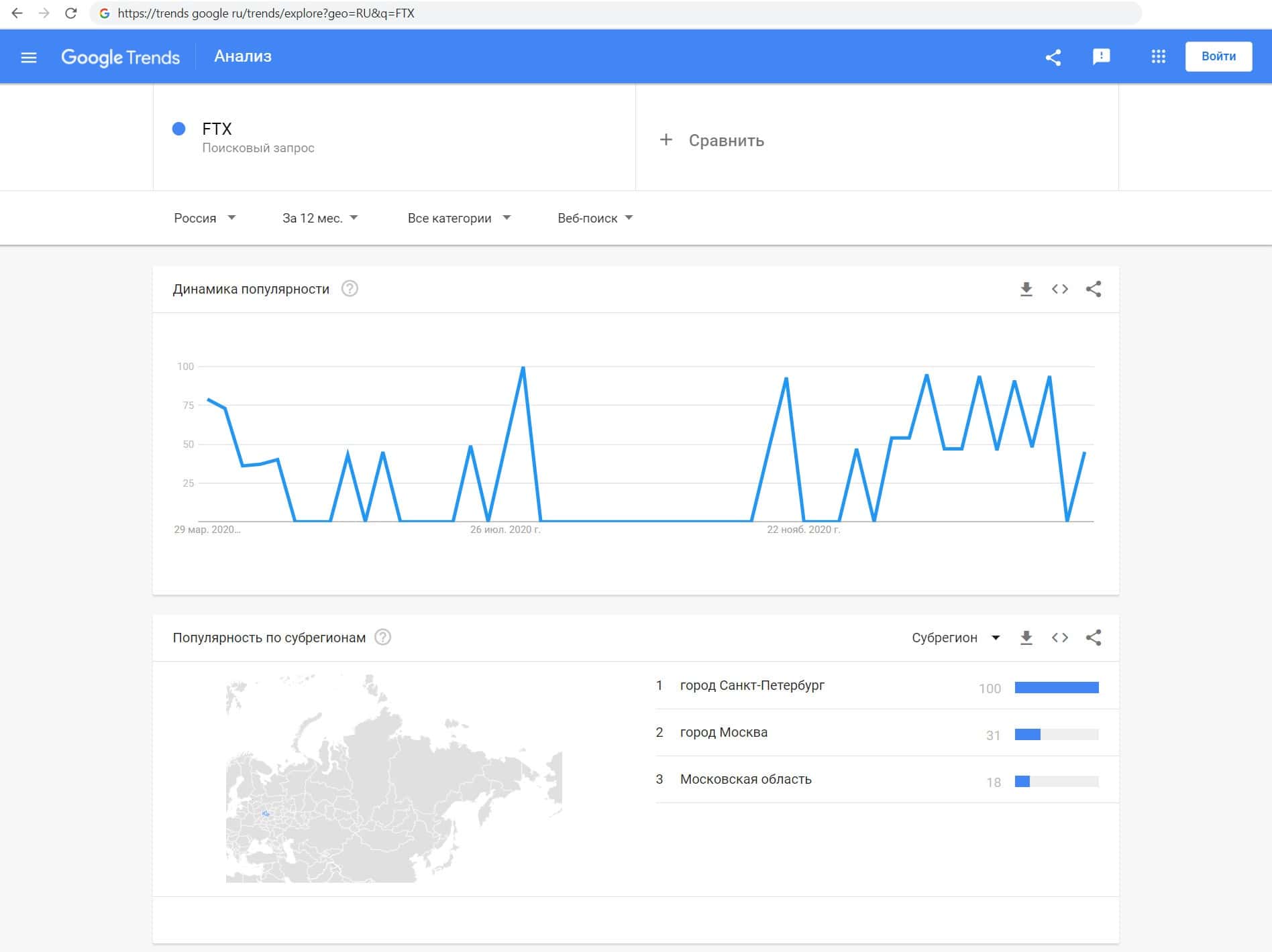 Мы проверили количество запросов лохотрона FTX в Google по названию компании, а именно "FTX". Данный запрос выполняли в основном пользователи из Санкт-Петербурга.
